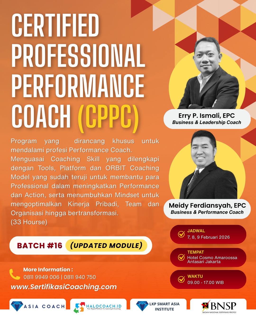 Certified Professional Executive Coach7, 8, 10 Februari 2026Program yang dirancang khusus untuk menjadi seorang Professional Executive Coach |